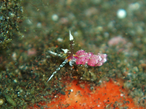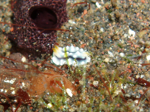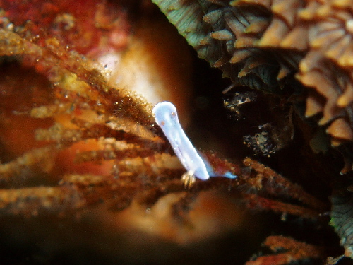真っ白なキセワタガイ、ニシキフウライペア、アカククリ、ヒレナガネジリンボウ、ピンクスクワットロブスター(あちらこちら多数)、ウツセミミノウミウシ、イロウミウシの仲間、スイートジェリーミドリガイ?など