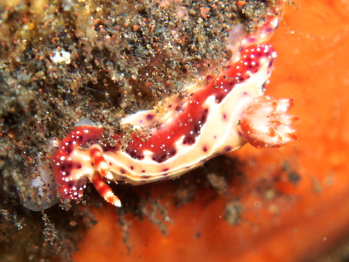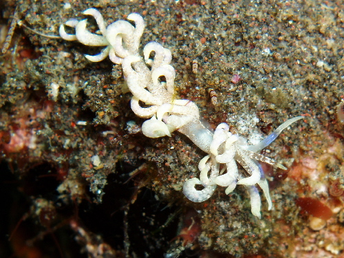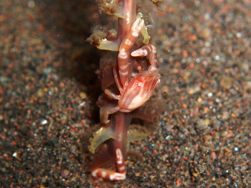 入ってすぐセンテンイロウミウシ、ヒレナガネジリンボウ&ランドールズピストルシュリンプをみて(なかなかダイバーなれしているせいか引っ込まない)