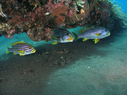 アヤコショウダイとムスジコショウダイが仲良くマストの下を根城にしていました。