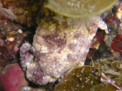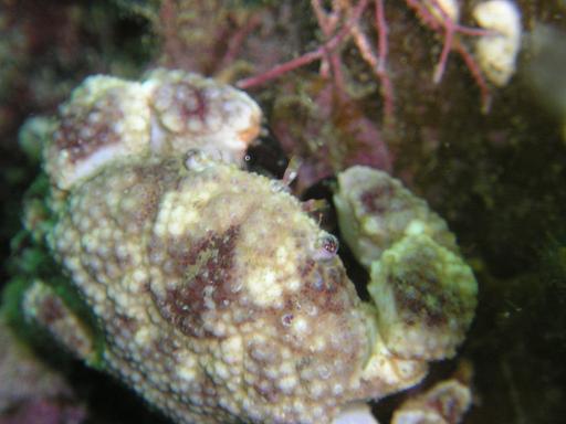 名前はわかりませんがオウギガニとサメハダガニをかけたような姿です。(写真中、右)横幅3cmほどでした。